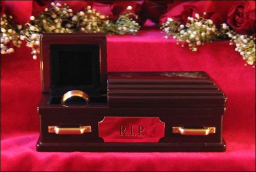 Les Américains jamais à court d'idées commerciales proposent désormais d'enterrer concrètement la fin d'un mariage, dans un coffret à bijoux représentant un mini cercueil qui recueille l'alliance.