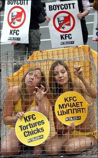 La manifestation s'est tenue dans le cadre d'une vaste campagne de l'organisation internationale Peta (People for ethnical treatment of animals) "pour attirer l'attention sur les souffrances de plus de 850 millions de volailles tuées annuellement par KFC", selon un communiqué distribué par les manifestants.
