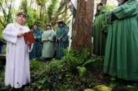 Vêtus d'aubes bleues, vertes ou blanches, les bardes (littéraires), ovates (scientifiques) et druides (sacerdoce et enseignement), une cinquantaine au total, se sont dirigés en procession vers l'orée d'une forêt, derrière des drapeaux bretons et au son d'un biniou, pour se retrouver autour d'une fontaine et de son eau "génératrice de vie".