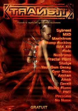 J'ai l'immense plaisir et l'honneur de vous annoncer que Transit, dont votre serviteur est membre actif, revit de ses cendres : son encombrant « chef historique » démissionné, ses dettes légendaires épongées, quelques concerts intéressants pour s'occuper, et nous voilà reparti sur un bon pied avec un numéro très étrange : il s'agit d'un « spécial groupes suisses » composer uniquement d'interviews inspectant un large spectre métal plus ou moins connu de par chez nous les franchouilles, mais très actifs au niveau de l'UG genevois : Your own decay, Eversince, Amok, Stump Fucking, Deceit, Nostromo, Fractal point, Maestrom, Sybreed, Arkhan...L'ensemble sonne plutôt death d'ailleurs, et les groupes de HXC qui pullulent là-bas nous ont été heureusement épargnés. A noter que nombre des groupes figurant dans ses pages ont déjà été dénichés par nos fins limiers de La Horde, car ils s'expriment aussi dans nos pages. Autres particularités pour ce numéro-phénix : il est en format A5, moins épais, avec une compilation CD dedans : il fut distribué confidentiellement, au cours d'un concert de certains groupes figurant à l'intérieur ; mais le fameux zine romand gratuit que vous connaissiez dans sa forme classique reprend du service dès le printemps 2005 ! Metal-heads Helvètes et Allobroges, soyez au rendez-vous !