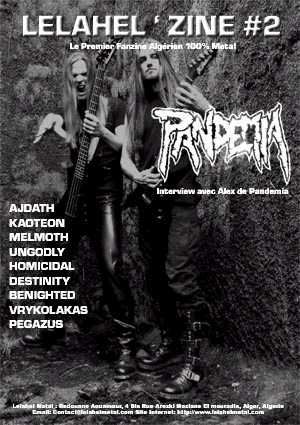 Quel étonnement que de découvrir un zine émanant des pays arabo-musulmans, écrit dans un bon français, qui plus est ! Derrière Lelahel zine se cache en fait Redouane, infatigable activiste du métal extrême algérien (membre de Litham, et « cerveau » de Lelahel prod). Mais Lelahel n'a pas de barrières géographiques : vous trouverez des chroniques (Parfois un peu laconiques) et d'intéressantes interviews de groupes américains, européens ou arabes : Jane Schuldiner (mère de Chuck), Homicidal, Benighted, Requiem, Pegazus, Melmoth, Destinity, Kaoteon (les martyrs du métal libanais), Ungodly...Et même un live report d'un festival organisé à Alger par Lelahel ! Rafraîchissant, ce zine, aidé de sponsors européens, nous prouve que le métal est une musique internationale ; même si son berceau reste évidemment l'Occident, le métal a aussi sa personnalité propre au Maghreb et au Proche Orient. Et surtout, vous découvrirez, en filigrane que notre musique favorite se heurte vraiment à l'ignorance dans certains pays... de Beyrouth à Los Angeles, en passant par Singapour, résonnent les mêmes mots : « Fuck the system » !!! Présentation classique et propre. A soutenir !