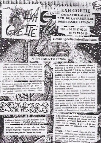 Suite à la distro complète de début d'année, plusieurs additifs dont celui-là sortiront en cours d'année. Quelques références disponibles sont chroniquées. Sinon, cette liste de distro axée métal extrême UG est habilement complétée de deux interviews assez courtes mais intéressantes : Gorgon et Epheles. Quelques annonces diverses complètent l'ensemble. Mise en page cut'n'paste à la punk, mais SANS photos de cul !