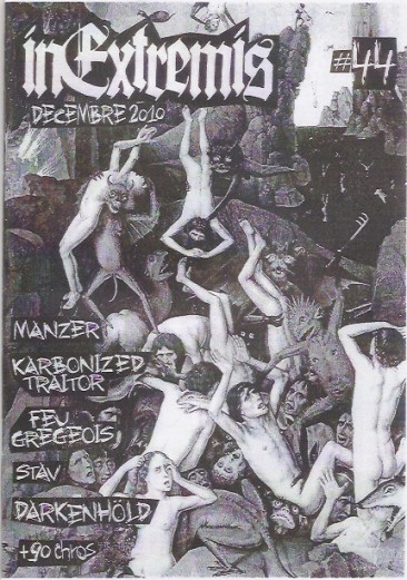 Diantre, quarante quatre numéro déjà ! Quarante quatre fois, j'ai reçu cette newsletter en 20 exemplaires, quarante quatre fois j'ai dû la dispatcher en la distribuant (parfois de force pour les puceaux) autour de moi, la déposant aux concerts, ou en la fourrant dans tous les courriers qui avaient un rapport avec la zique de bucherons.... Et pourtant, pas une ride, hormis celle, bien naturelle au demeurant, du fessier de l'auteur/rédacteur Jean. Pour commencer, l'édito est prolixe, encore sous forme d'un bon coup de gueule réagissant à la sentence quasi-inquisitoriale qui est tombée sur un plaisantin postant une vidéo caricaturant l'islam... Déjà convertis au mahométanisme, ou simples politiquement corrects, rhabillez-vous et lisez Hard Rock Mag ! Par contre, s'il vous reste un esprit critique, vous apprécierez celui inspirant les 90 chroniques de skeuds récents ; certaines sont même bien calibrées pour percer le ventre mou de groupes mauvais et / ou opportunistes. La page chroniquant les confrères des fanzines est une bonne idée qui persiste, tant mieux ! Enfin, les cinq interviews sont également bien balancées, donnant uniquement la parole à l'UG français : les fous de KARBONIZED TRATOR (punk/métal alcoolique), les blackeux de DARKENOHLD, FEU GREGOIS et son death mélodique, MANZER (black/thrash old school) et les jeunes STAV avec leur démo de métal extrême. READ & SUPPORT !!! Toujours gratuite auprès des bons dealers de métal extrême comme LHN...
