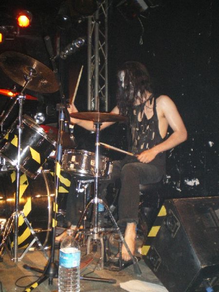 BLACK LODGE investit ensuite la scène, pour sa part avec ses trois membres (dont un nouveau guitariste sur cette tournée) totalement maquillés contrairement aux sessions photos, mais fidèle à son folklore spécifique avec les fameuses seringues en guise de brassards cloutés. Et une homogénéité visuelle avec pour chaque membre un symbole occulte solaire, sans cependant le traditionnel décors en aluminium que le groupe utilise depuis ses débuts, probablement en raison de la petitesse de la scène. J'étais assez curieux de redécouvrir ce groupe sur scène que j'avais vu à ses débuts en première partie de Impaled Nazarene à Grenoble en 2000. Car depuis ses débuts Blacklodge a tenté de développer une identité musicale et conceptuelle aujourd'hui bien approfondie (cf interview de 2006). Comme il fallait s'y attendre, une partie de la salle s'est progressivement vidée en raison de l'étroitesse bien connu d'un public imprégné de cliché et qui manque de curiosité, probablement déjà désappointé par l'absence de batterie au profit d'une boite à rythme excellente produisant des beats assez durs. Tandis que l'autre partie du public (on pouvait d'ailleurs apercevoir un t-shirt Mysticum, le premier groupe s'étant immergé dans cette voie) appréciait cette formation. Celle-ci se révèle actuellement l'une des plus intéressantes dans le domaine du black metal industriel comme en témoigne leur très bon second album Solar Cult, largement présenté ce soir, qui à mon avis a un peu plus développé ce style de black qui malgré maintenant une certaine ancienneté semble hésiter à pousser trop loin ses limites. Le groupe était d'ailleurs passé il n'y a pas très longtemps dans cette salle où il avait souffert de gros problèmes sonores dus au côté amateur de la salle. Pour cette fois, la prestation sonore m'a paru tout à fait convenable permettant de distinguer les différents effets et programmations qui sont part entière de la musique de Blacklodge. Malgré l'isolement de la salle, celle-ci n'est pas à l'abri de paumés de service et ce soir-là ce fût un junkie, certes sympathique, qui finit par offrir des bières au groupe, qui criait "A poil ! " (On n'échappe pas à son passé de modèle !)