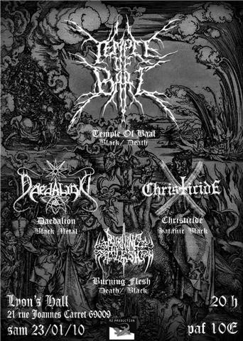 Les Bourguignons de Christicide semblent attendus, car leurs apparitions scéniques sont rares. Mais nous avons la joie de découvrir que la tempête de crasse et de haine qui déborde de leur deux productions, à savoir la démo Apex Of Negativity et le LP éponyme est bien retranscrite sur scène. Bien en place, avec un léger maquillage de noir autour des yeux et des colliers d'os, le groupe déverse un torrent de black metal hypnotique sur un public compact, paralysé par les tempi très élevés que Christicide affectionne. Un grand moment de true black metal très apprécié.