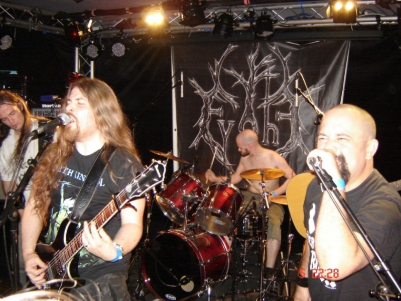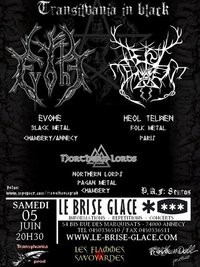 Enfin, Evohe clôture le set : mais ce groupe n'est plus un inconnu pour nous : venu également de Savoie voisine, il écume la région depuis 2002, et proposent ce soir son black métal cru et direct aux plus fanatiques des membres du public (dont je suis). le quatuor est maintenant bien rôdé : de la haine, de la rage, de la vitesse émergent de ce show hypnotique et sans fioriture. Tous les musiciens (sauf le batteur) assurent alternativement le chant, ce qui est pour le moins peu courant et donne du dynamisme au set. Nous reconnaissons un ou deux titres des démos, et surtout ceux du premier album Tellus Mater , mais aussi des morceaux inédits et bien prometteurs d'un second album qui doit sortir bientôt. Un rappel péniblement acquis (et oui, on ose dépasser la date de minuit, heure du crime...) nous permet de déguster le titre le plus furieux de la démo Non Serviam.