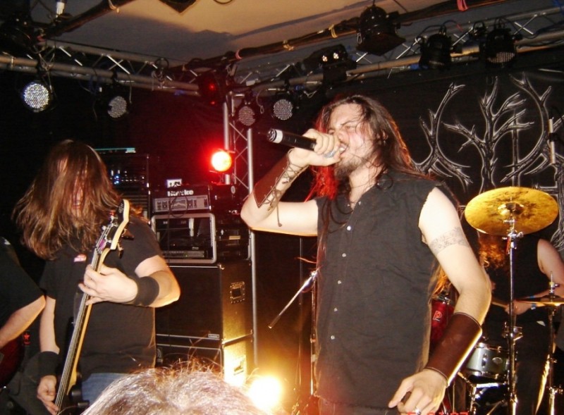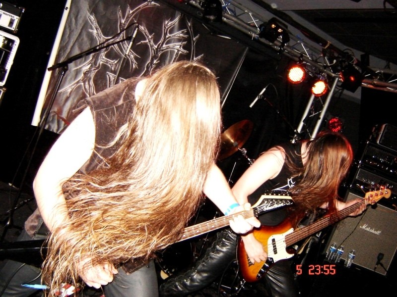Les Parisiens de Heol Telwen appartiennent à ce courant pagan/black metal si prolifique dans leur ville : dans le sillage de AES DANA, NYDVIND et autres BRAN BARR), Heol Telwen sait marier intimement la rage et la froideur du black metal avec des mélodies rafraichissantes bien pagan ; en particulier, on remarque un membre joueur de flûte, alternant avec des backing vocals. Ils proposent les titres du premier album An Deiz Ruz (sorti en 2005) mais aussi d'un futur second opus. Mais, il faut bien l'avouer, les dieux ont tout faits pour leur barrer la route : les problèmes techniques s'accumulent outrageusement pendant tout le set, frappant quasiment tous les musiciens, mais ne leur faisant jamais perdre le fil d'un titre, ni leur bonne humeur, d'ailleurs. Leur expérience sur scène est évidente, et la salle est maintenant totalement bondée. Un très beau succès scénique pour Heol Telwen, malgré des conditions techniques cauchemardesques !